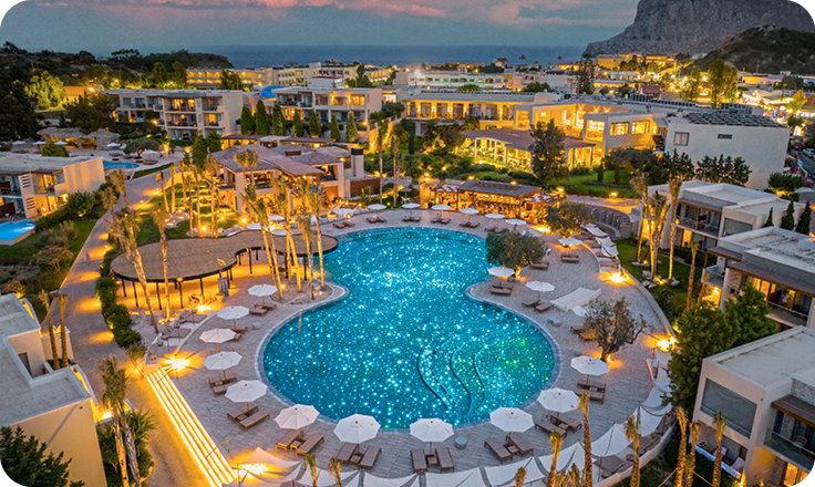 Naturbelassene Materialien und die Poollandschaft, die nachts an einen Sternenhimmel erinnert, zaubern ein einmaliges Ambiente. Von Mai bis Oktober 2026 genießen Sie hier ein wohltuendes Yoga Retreat mit der Möglichkeit, Personal Training in Anspruch zu nehmen.